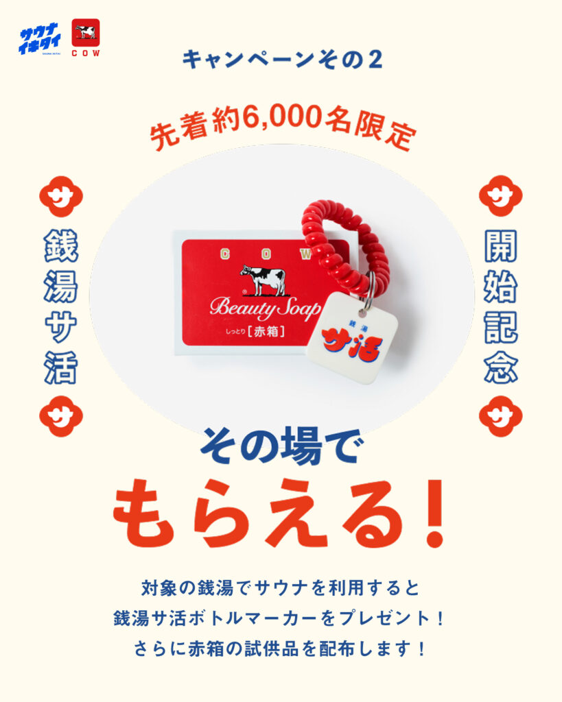 当店赤ビルの湯も対象施設なのでweb引換券のご提示で銭湯サ活オリジナルボトルマーカーと牛乳石鹸赤箱試供品をプレゼントいたします。